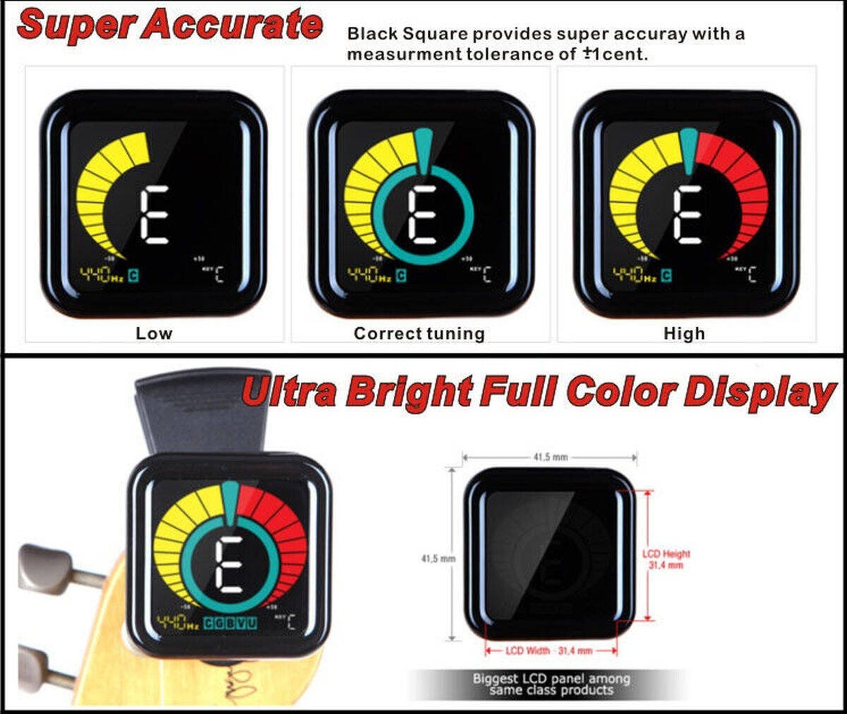 - Afișaj LCD color: Acordat verde, dezacordat =roșu sau galben